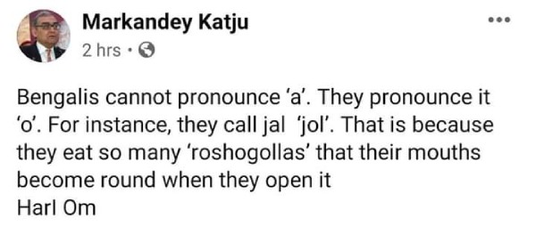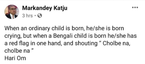 এরপর বাঙালির রসগোল্লা প্রীতির বিষয়টিকেও নিয়েও মজা করা হয়েছে। এবং যতই সময় এগিয়েছে ততই কাটজুর পোস্টের মধ্যে ধরা পড়েছে রাজনৈতিক বক্তব্য। যেখানে বলা হয়েছে যে, একজন সাধারণ শিশু জন্মানোর পর সে কেঁদে ওঠে। কিন্তু, একজন বাঙালি শিশু জন্মানোর পরে তার এক হাতে থাকে লাল ঝান্ডা এবং সে চিৎকার করতে থাকে ‘চলবে না চলবে না’!