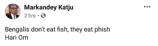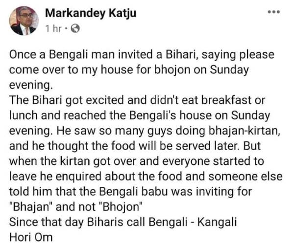 এছাড়াও কাটজুর অপর একটি পোস্টে উঠে এসেছে বাঙালি এবং বিহারিদের নিয়ে নিন্দনীয় মন্তব্য। একজন বাঙালির বাড়ি থেকে ভজনের অনুষ্ঠানে যোগ দেওয়ার নিমন্ত্রণ পেয়ে একজন বিহারি সেখানে ভোজন হবে ভেবে পৌঁছে গেছেন। কিন্তু পৌঁছে গিয়ে খাবারদাবারের ব্যাবস্থা না দেখতে পেয়ে সেদিন থেকেই নাকি বিহারিরা বাঙালিদেরকে ‘কাঙালি’ বলে ডাকা শুরু করেছে। পোস্টের ভাষা, শব্দ চয়নই বলে দেয় কতটা নিচু মানসিকতার হতে পারে এই বক্তব্য।