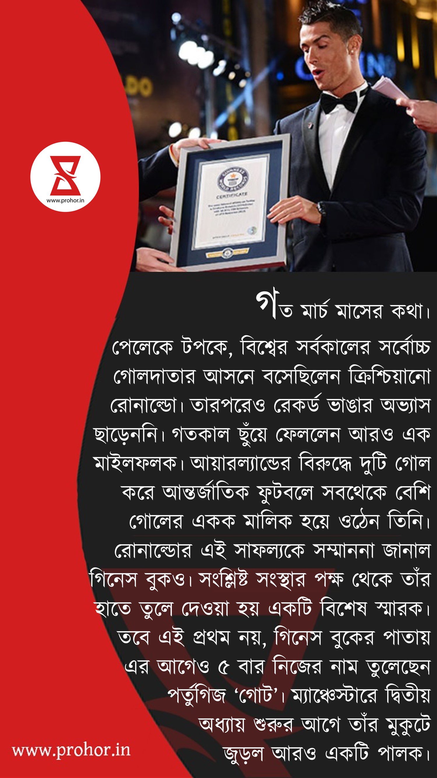 রোনাল্ডোর সাফল্যকে স্বীকৃতি জানাল গিনেস বুক গতকালই দেশের জার্সিতে ১১১তম গোল করে সৃষ্টি করেছিলেন নতুন ইতিহাস। রোনাল্ডোর সাফল্যকে স্বীকৃতি জানাল গিনেস বুক...#Prohor #NewsPortal #ChristianoRonaldo #Football #GuinnessBookOfWorldRecords #MileStone #TopInternationalGoalScorer #Record