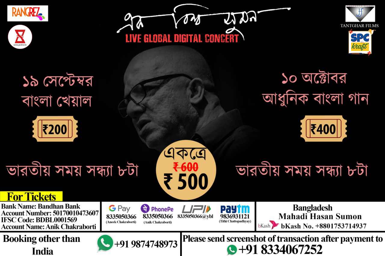 সেই আশার গুড়কে জমাট বাঁধাতে রঙরেইজ আর তাঁরঘর নামে দুটি সংগঠন যৌথভাবে আগামী ১৯ সেপ্টেম্বর অনলাইনে ‘এক বিশ্ব সুমন’ নামে বাংলা খেয়ালের একটি ডিজিটাল কনসার্টের আয়োজন করেছেন। এতোদিন শুধু দূর থেকেই বন্ধুদের মাধ্যমে কবীর সুমনের নানা অনুষ্ঠানের খবর পেয়েছি। ভাগ্য খুব ভাল হলে, কোন সুমন প্রেমীর হল রুম থেকে কাঁপাকাঁপা হাতে মোবাইলে চুরি করে ধারণকরা বিচ্ছিন্ন শব্দের ছোট ছোট ভিডিও ক্লিপ দেখবার সুযোগ। কিন্তু ডিজিটাল কনসার্টের কারণে পেশাদারি শব্দে একটা আবিশ্ব সুমন শোনার সুযোগ হঠাৎ করেই আমাদের সামনে এসে গেছে। আয়োজকদের আমি ধন্যবাদ জানাতে চাই।