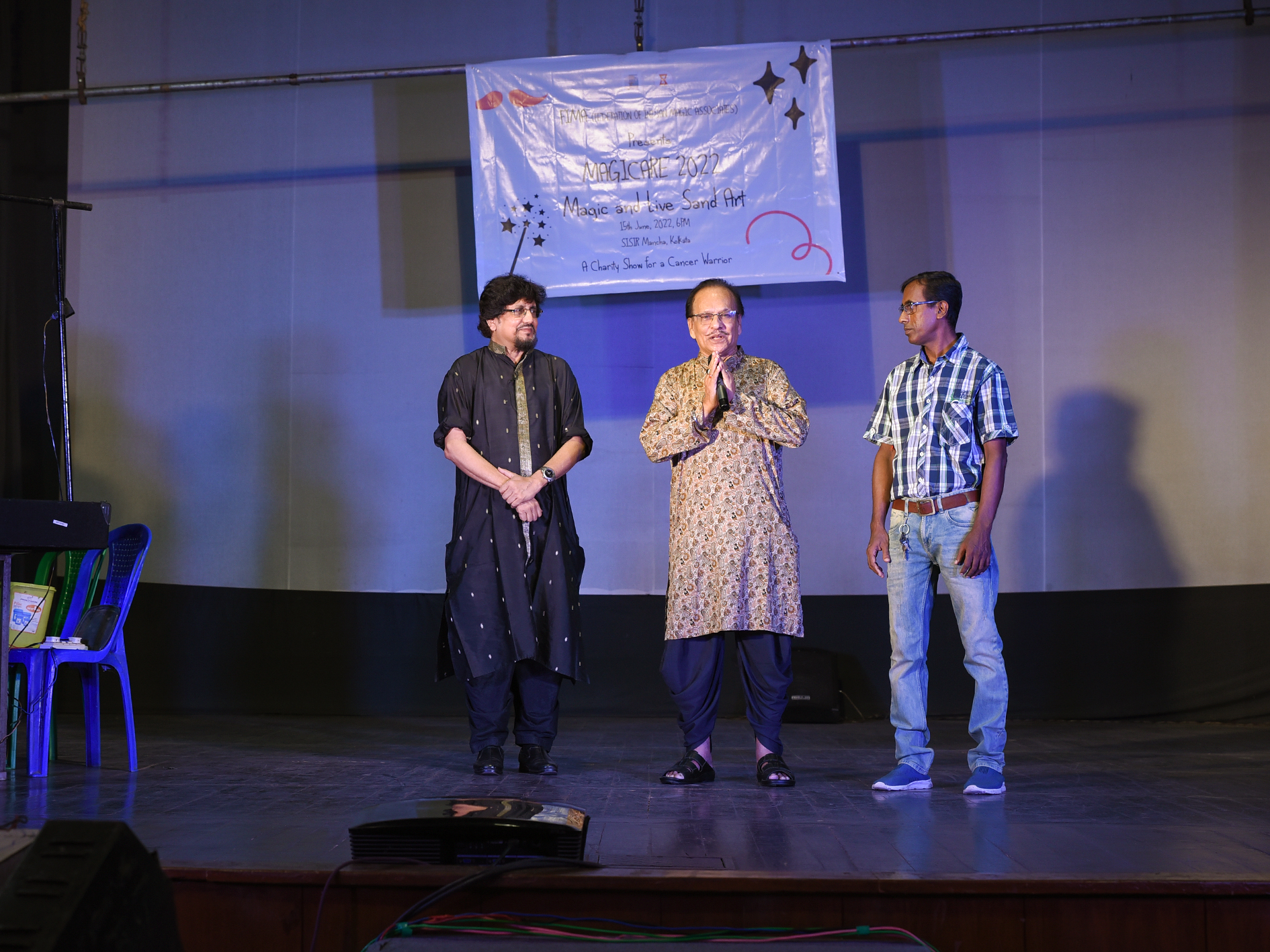ম্যাজিকের প্রদর্শনীতে নানা বয়সের নানা মানুষের ভিড় হবেই। বিশেষ করে একই মঞ্চে যদি উপস্থিত থাকেন বিভিন্ন বিষয়ে পারদর্শী জাদুকরেরা – তাহলে তো কথাই নেই। আর ফিমা আয়োজিত ‘ম্যাজিকেয়ার ২০২২’-এ ম্যাজিকের সঙ্গেই ছিল স্যান্ড আর্ট এবং হ্যান্ড শ্যাডোগ্রাফির প্রদর্শনীও। তবে এই সমস্ত শিল্পীরা এক মঞ্চে মিলিত হয়েছিলেন একটি অন্য তাগিদ থেকে। বিগত কয়েকমাস ধরেই গুরুতর অসুস্থ ফিমার অন্যতম সদস্য, হাওড়া ম্যাজিক সার্কেলের প্রেসিডেন্ট ম্যাজিশিয়ান বিশ্বজিত। তাঁর শরীরে ক্যানসার ধরা পড়েছে। চিকিৎসকরা অবশ্য আশ্বাস দিয়েছেন। কিন্তু চিকিৎসার জন্য বেশ কিছু অর্থের প্রয়োজন। আর সেই অর্থ জোগাড় করতেই শিশির মঞ্চে এই অভিনব প্রদর্শনীর পরিকল্পনা নিয়েছিলেন ফিমার সদস্যরা।